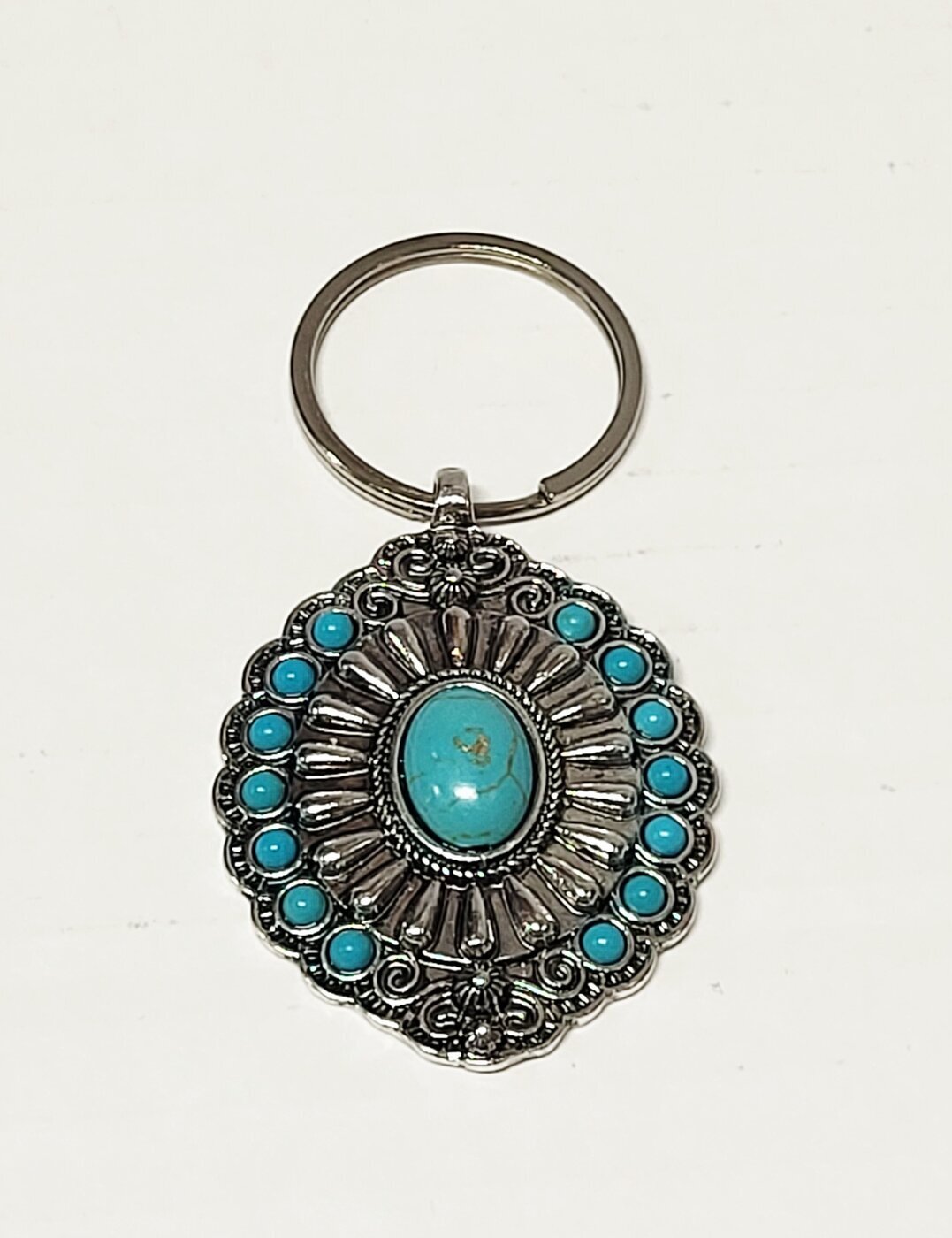 Metallinen avaimenperä turkooseilla kivillä.