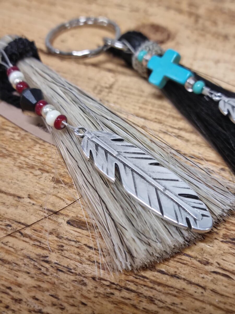 Upea käsityönä Montanassa USA:ssa aidoista hevosen jouhista valmistettu tupsu-avaimenperä. Tupsun lisäksi avaimenperässä helmiä ja sulan tai ristin muotoinen riipus. Helmien ja tupsujen värit vaihtelevat kappaleittain. Valittavana tumma tai vaalea.
