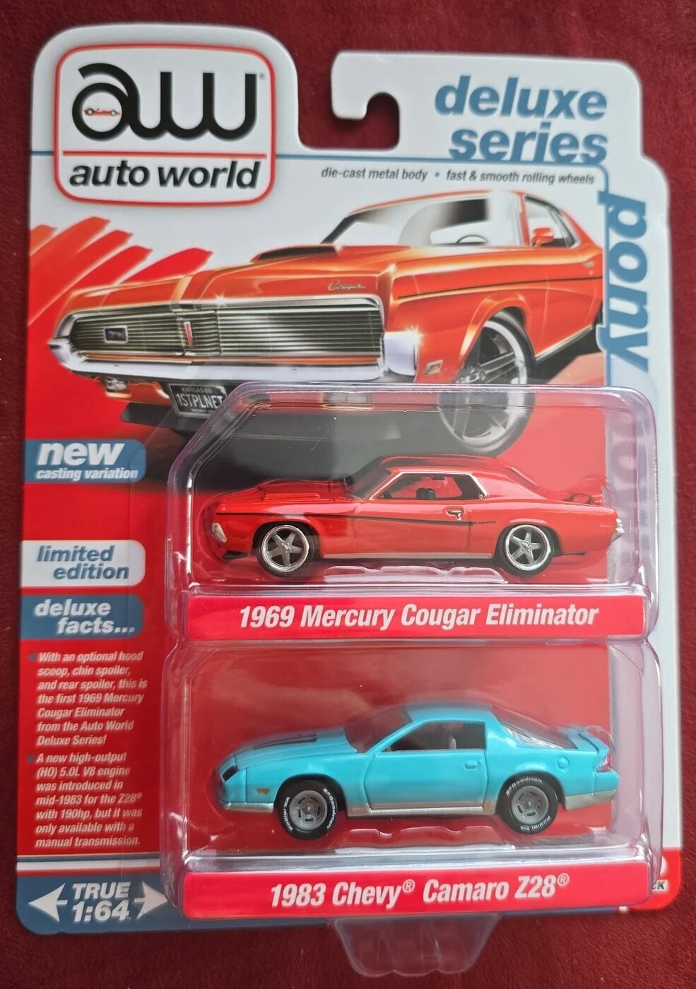 Pakkauksessa punainen 1969 Mercury Cougar Eliminator sekä vaalean sininen 1983 Chevy eli Chevrolet Camaro Z28.