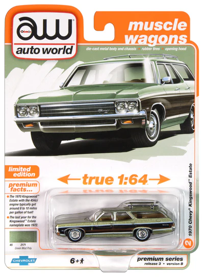 Auto Worldin eli AW:n Premium Series Muscle Wagons 1970 Chevy eli Chevrolet Kingswood Estate -pikkuauto, värissä Green Mist Poly. Pyörivät kumiset renkaat ja aukeava konepelti.