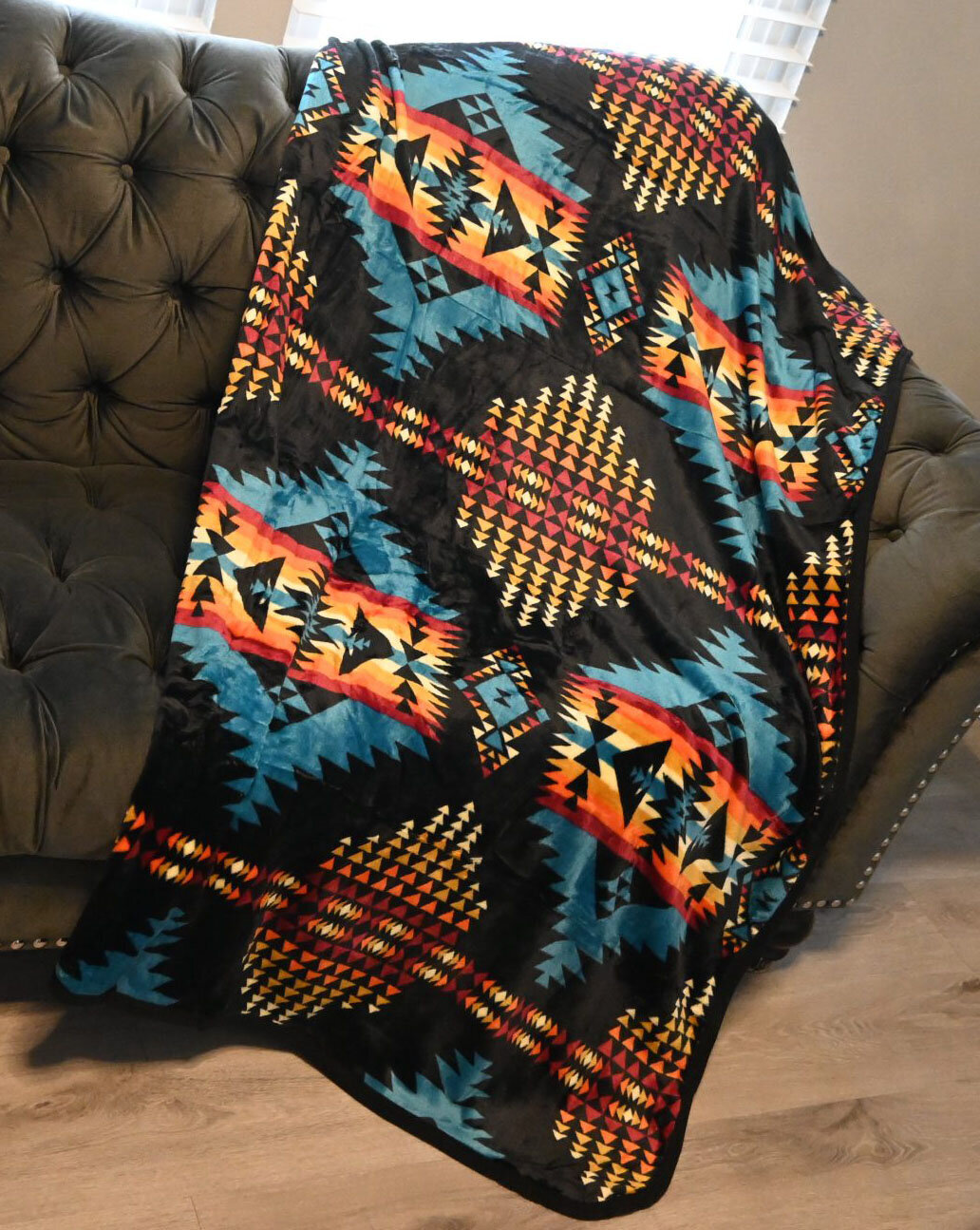 Ihanan pehmeä ja lämmin fleeceviltti Aztek kuviolla. Viltin kuvioissa loistavat upeat perinteisen Soutwestern-tyylin mukaiset luonnon sävyt: mustalla taustalla turkoosin, punaisen, oranssin ja luonnon valkoisen väriset isot Aztek-kuviot.