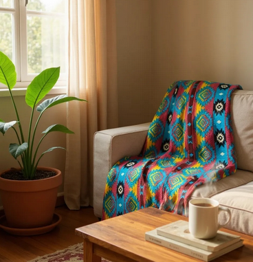 Ihanan pehmeä ja lämmin torkkupeitto / viltti Aztek kuviolla.