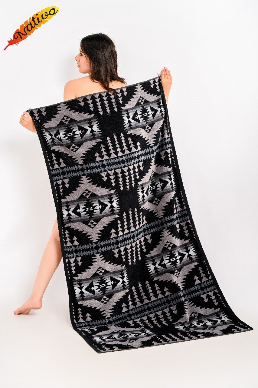 Aztek kuvioinen kylpypyyhe. Sopii esimerkiksi rantapyyhkeeksi!Koko: 91 x 170 cm.