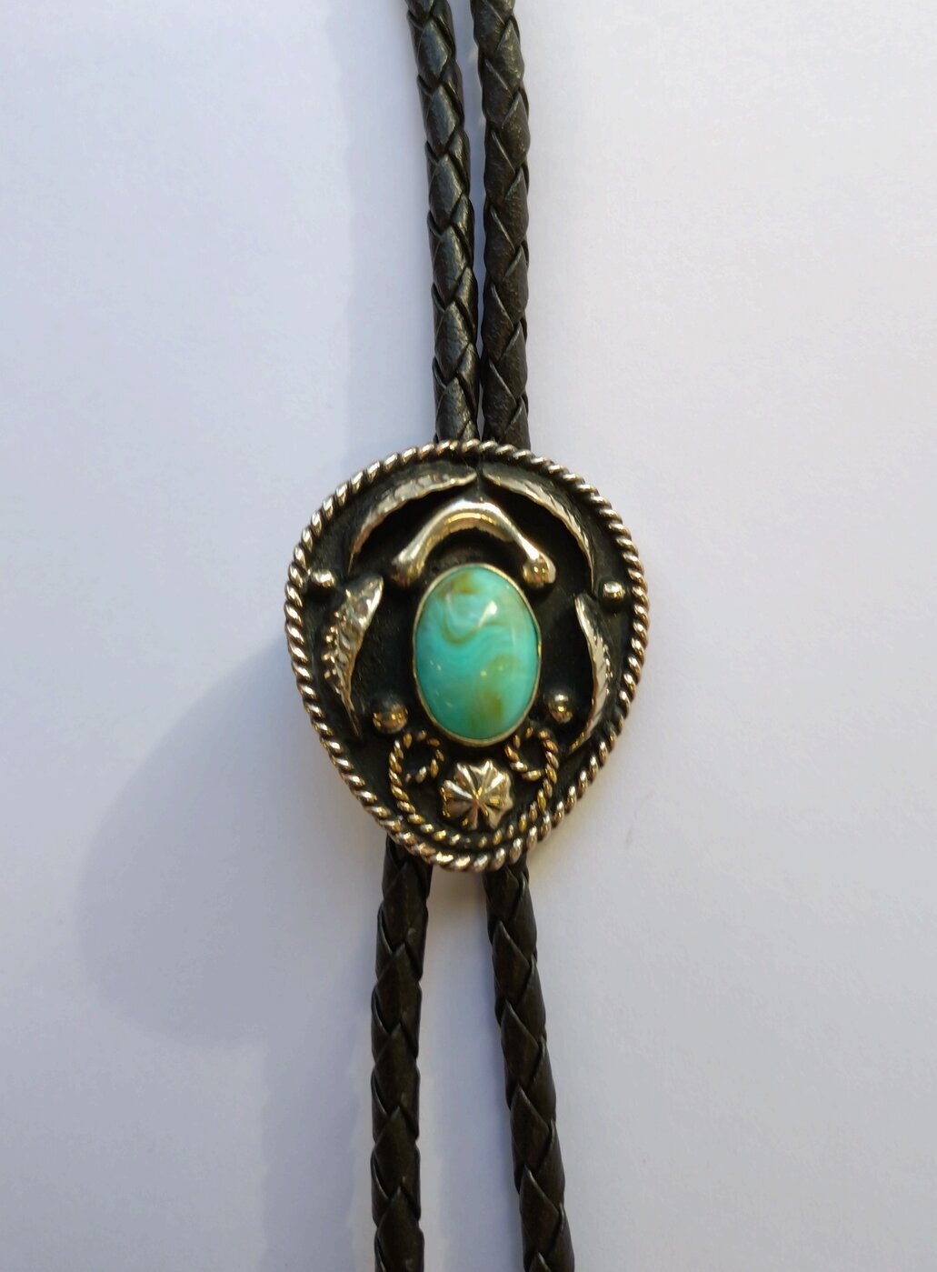 Bolokravatti nahkanyörillä, koru musta-hopean värinen, keskellä turkoosin värinen, soikea "kivi". Korun koko n. 3,5 x 3 cm.