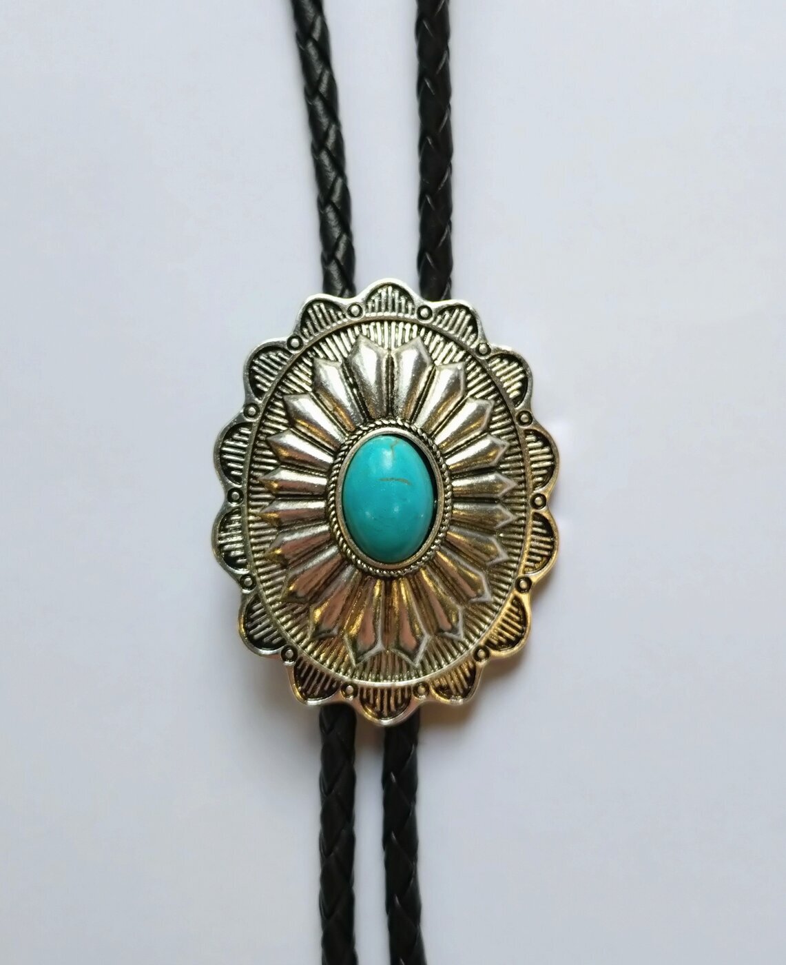 Bolo-kravatti nahkanyörillä, jossa koruna koristeellinen, hopean värinen, soikea concho, jossa keskellä soikea turkoosin värinen kivi.