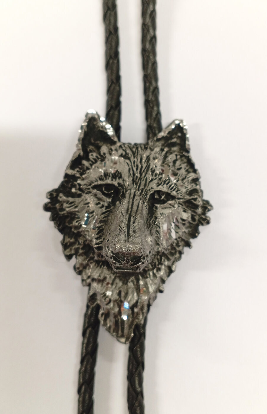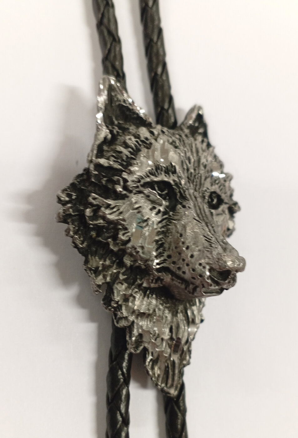 Bolo-kravatti nahkanyörillä jossa kolmiulotteinen suden pää.