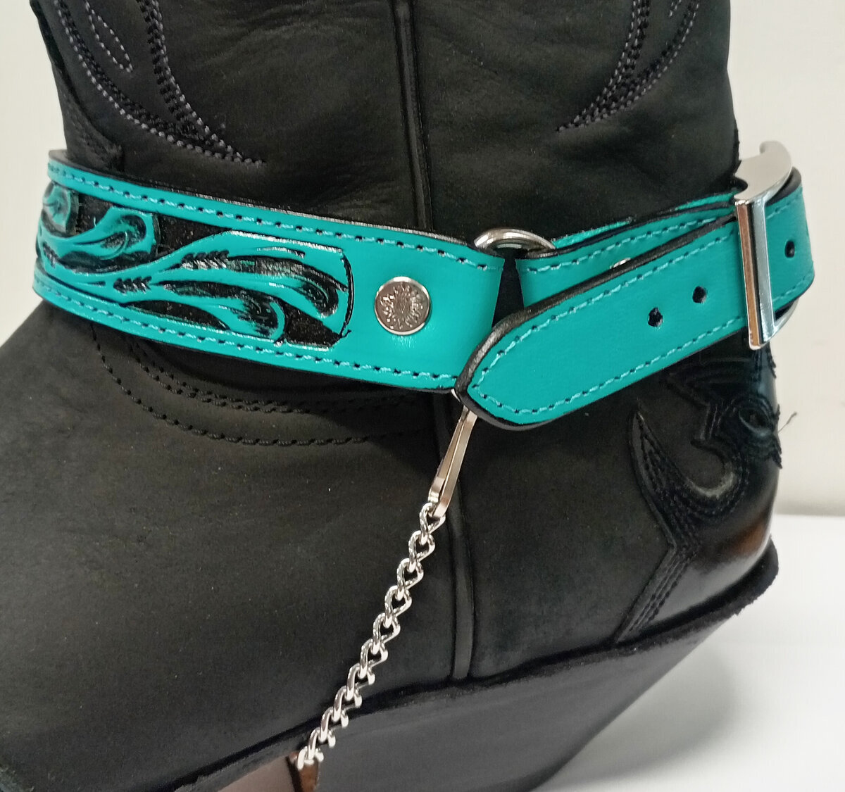 Turkoosiksi värjättyä nahkaa oleva bootsivitja ketjulla.Materiaali: nahka, metalli. Väri: turkoosi / musta.