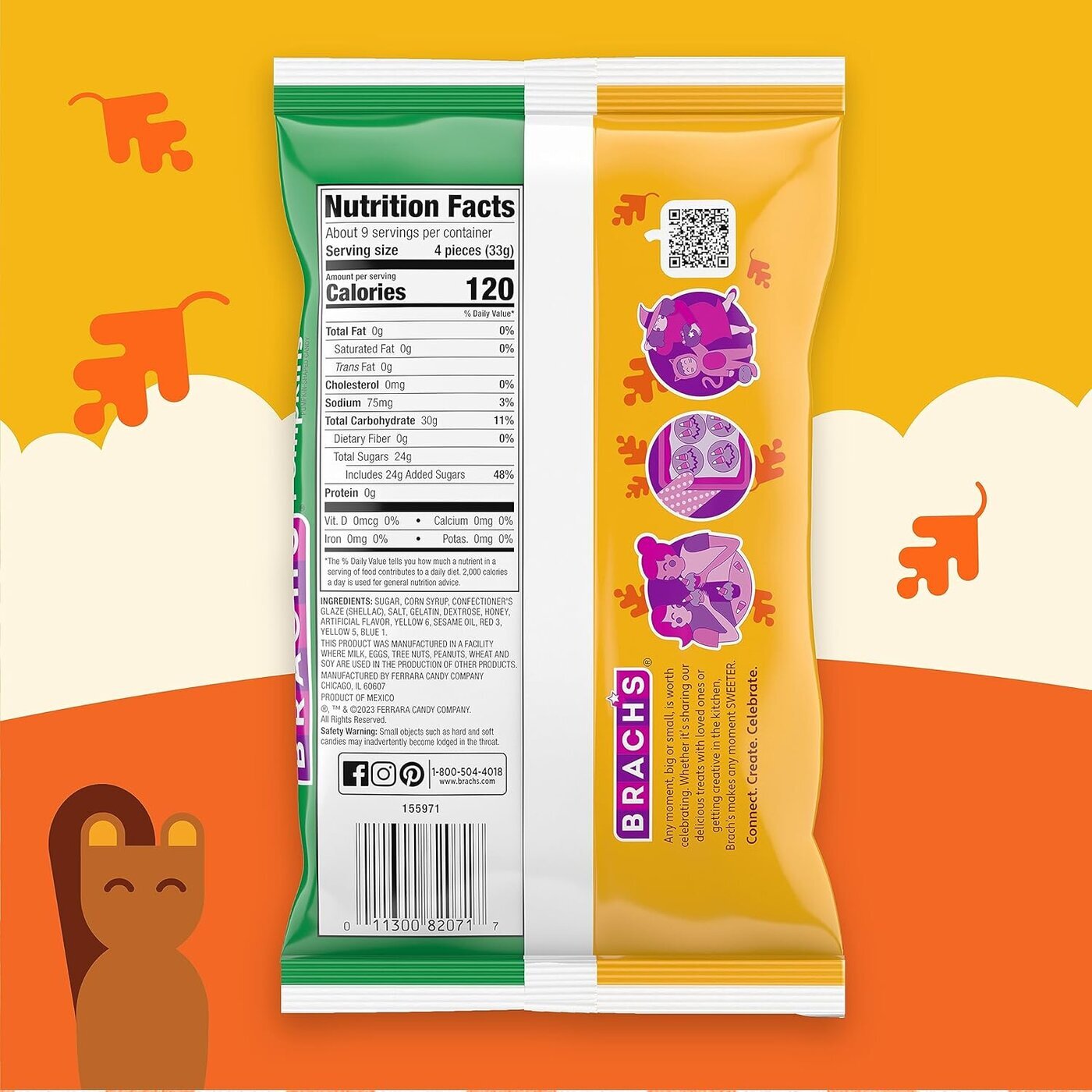 Halloween kurpitsa-karkit 311g / Brach's Mellowcreme Pumpkins 11oz. Ainesosat: Sokeri, maissisiirappi. Sisältää 2% tai vähemmän: suola, sellakka (E904),gelatiini, hunaja, dekstroosi, makeutus- ja väriaineet E110,E122, E102, E132, seesamiöljy. Tuote on valmistettu samoissa tiloissa, missä käsitellään maitoa, munia, pähkinöitä ja soijaa.