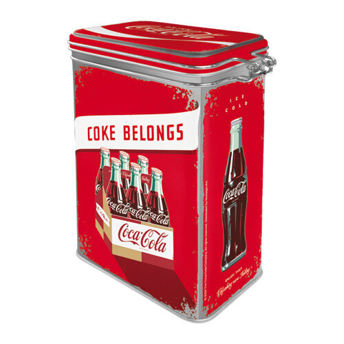 CocaCola peltipurkki vahvaa teräspeltiä.3D-kohokuvioitu, mattapinta.Kansi klipsikiinnityksellä.Ilma- ja aromitiivis, elintarvike hyväksytty.