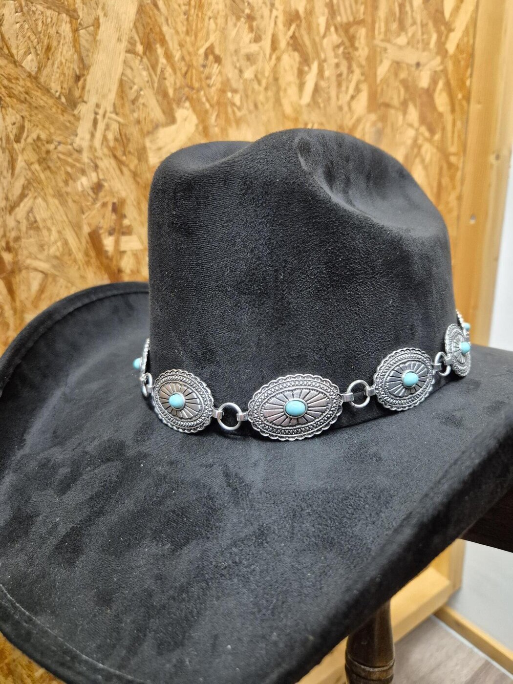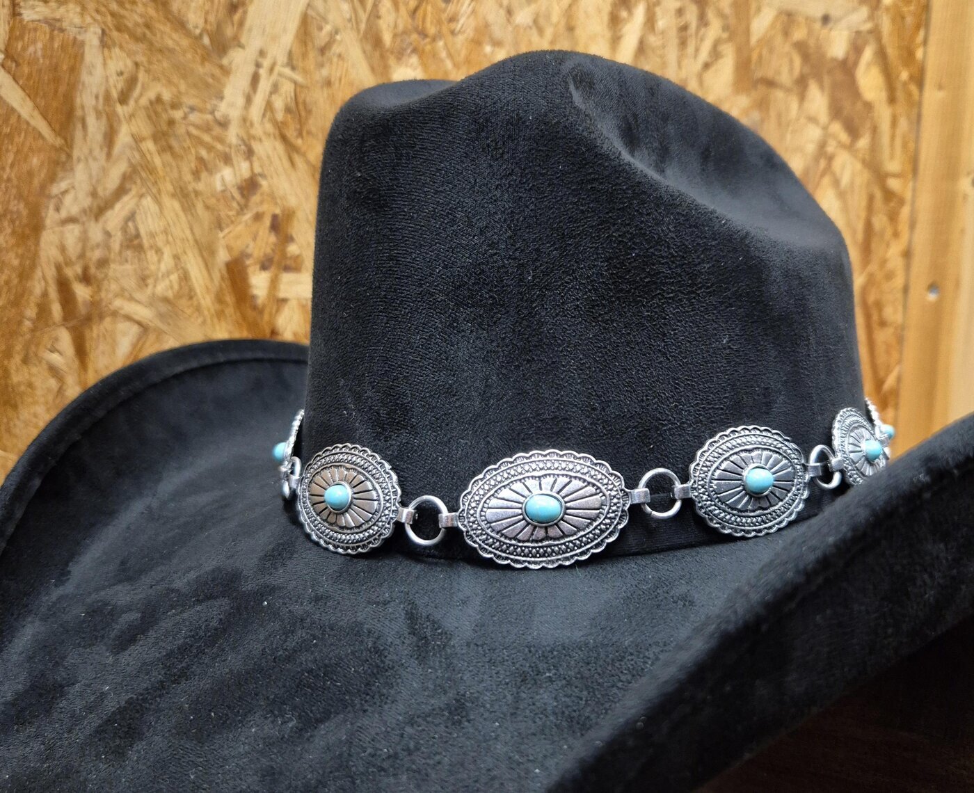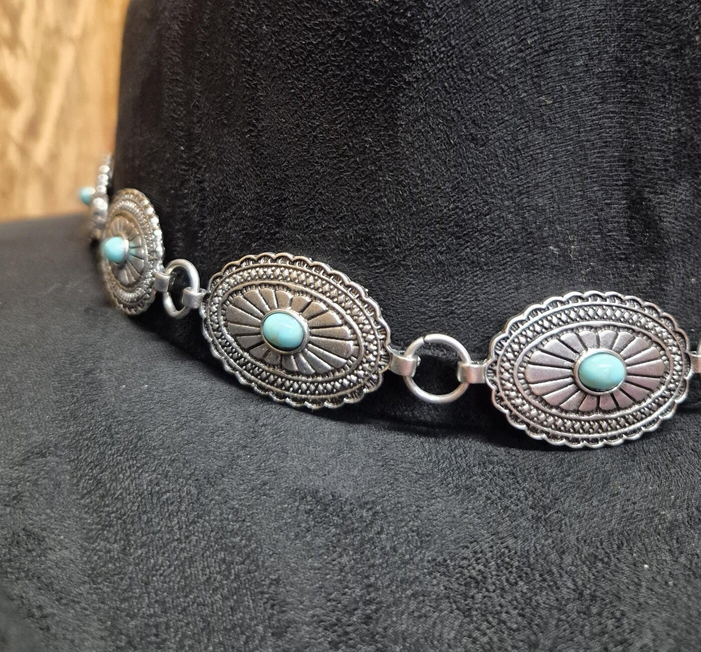 Vaihto-panta westernhattuun. Ketjussa metallisia, soikeita, koristekaiverrettuja conchoja, joiden keskellä turkoosin väriset kivet. Conchojen väleissä pyöreät lenkit.