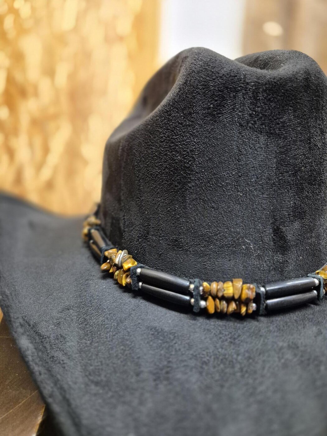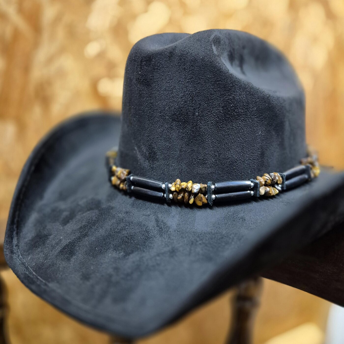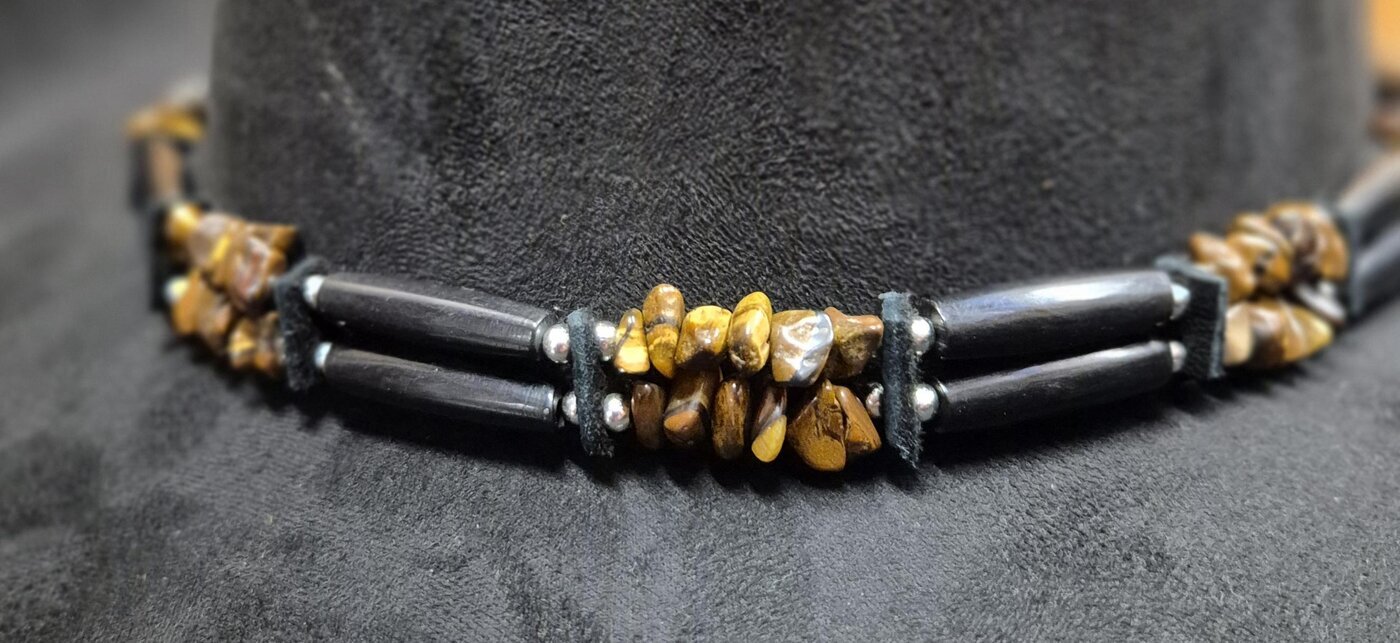 Vaihto-panta westernhattuun. Kaksiriviseen nauhaan punottu vuorotellen ruskeita kiviä ja pitkiä, mustia, muovisia helmiä. Väleissä pienet, hopean väriset, pyöreät helmet ja palat mustaa nahkaa.