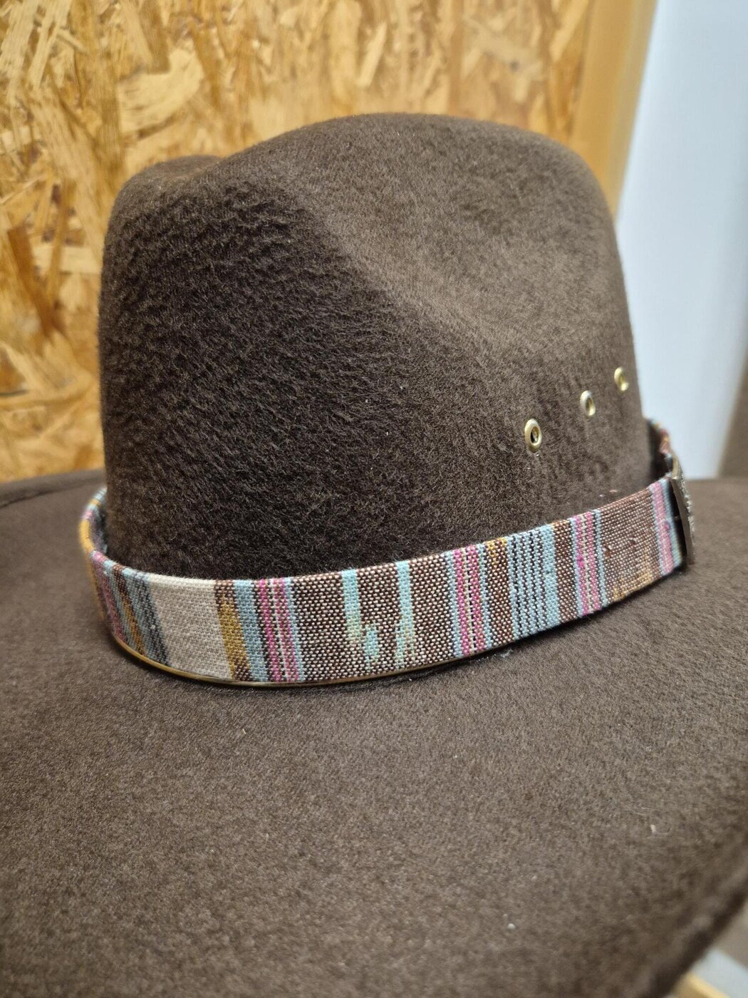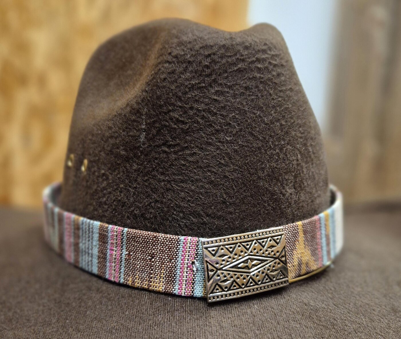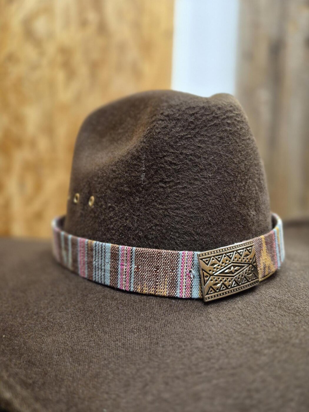 Kudottua, vaaleaa, moniväristä Aztek-kuvioista kangasta oleva vaihto-panta westernhattuun, jossa koristeena upea metallinen solki.