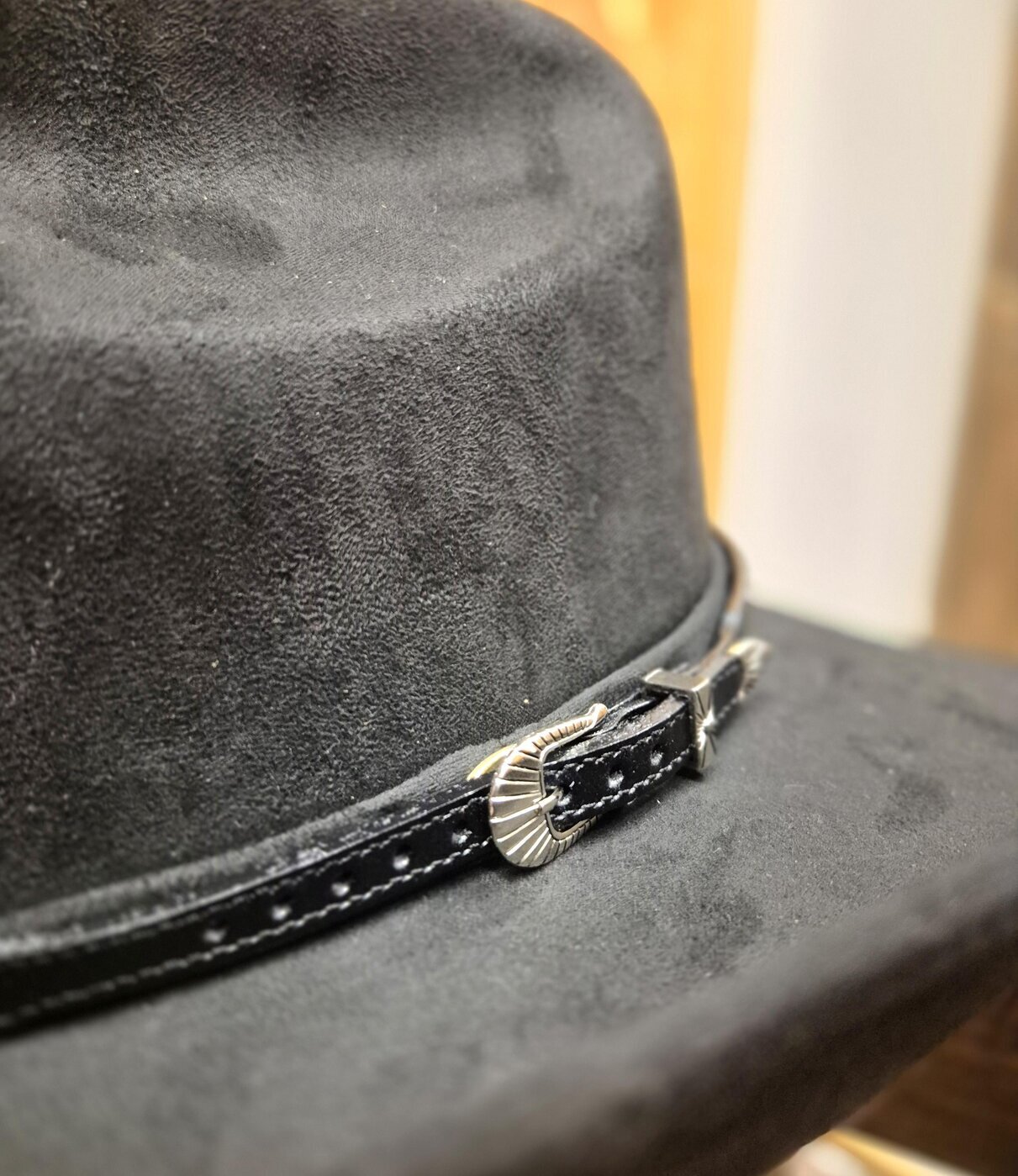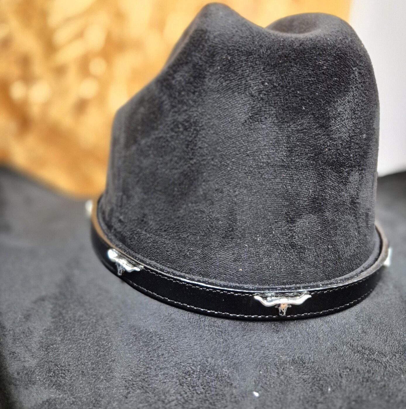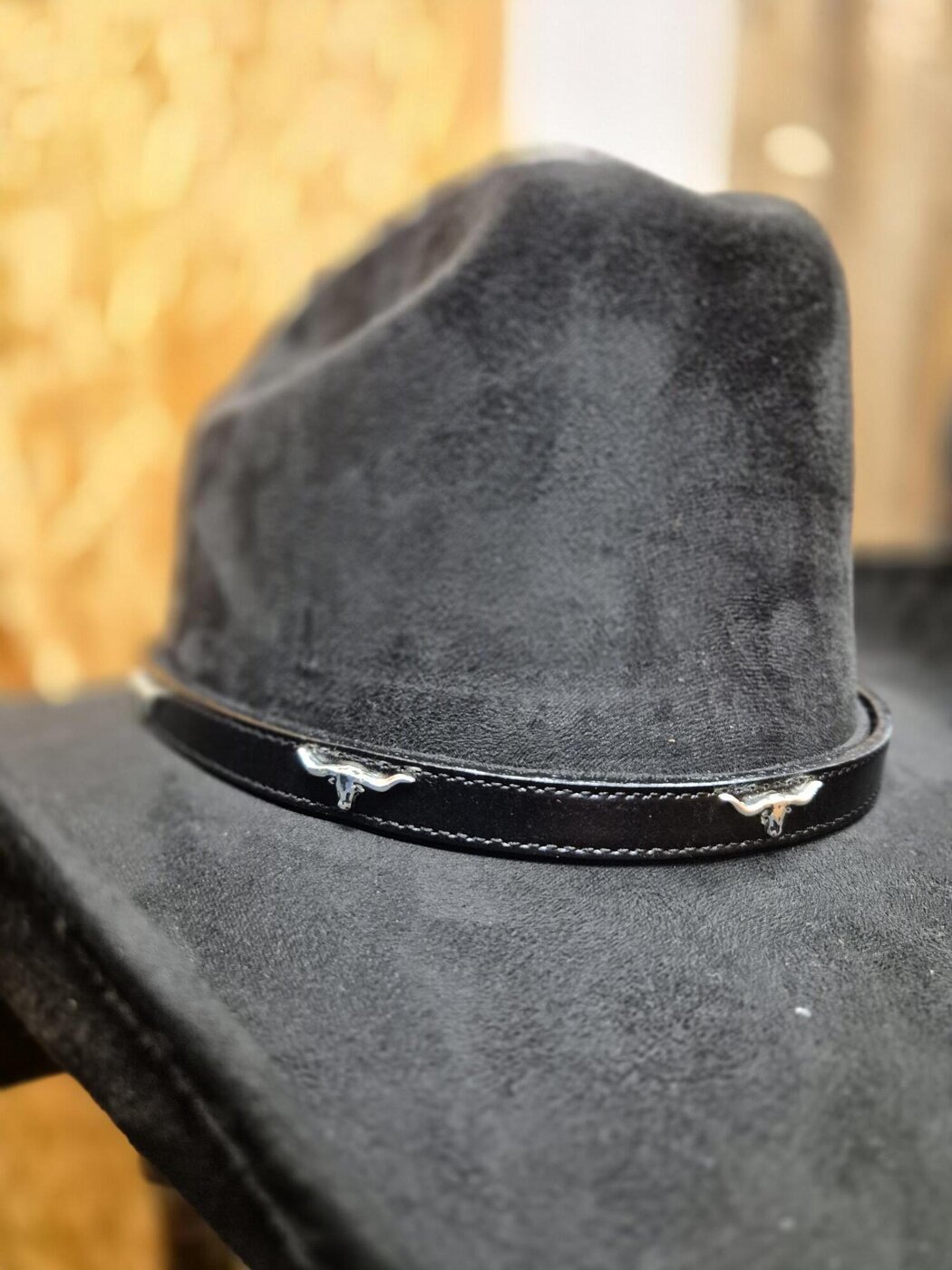 Vyön mallinen hattupanta mustaa, sileää nahkaa, jossa koristeena 7kpl metallisia, hopean värisiä Longhorn-koristeita. Metalliset, koristekaiverretut solki, vyöpidike sekä -kärki.