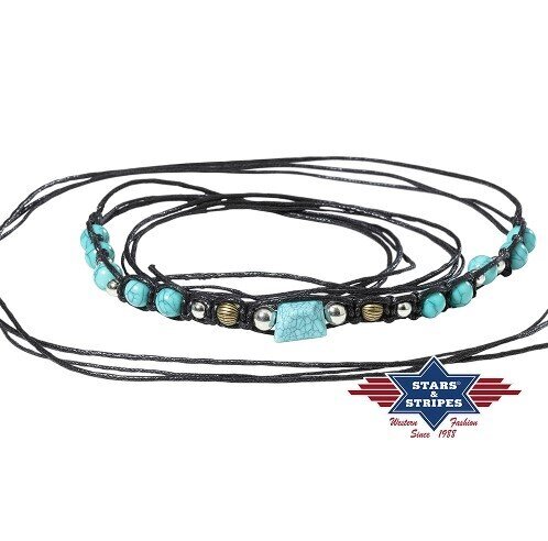 Punottu vaihtopanta westernhattuun, jossa muovisia turkooseja sekä helmiä.