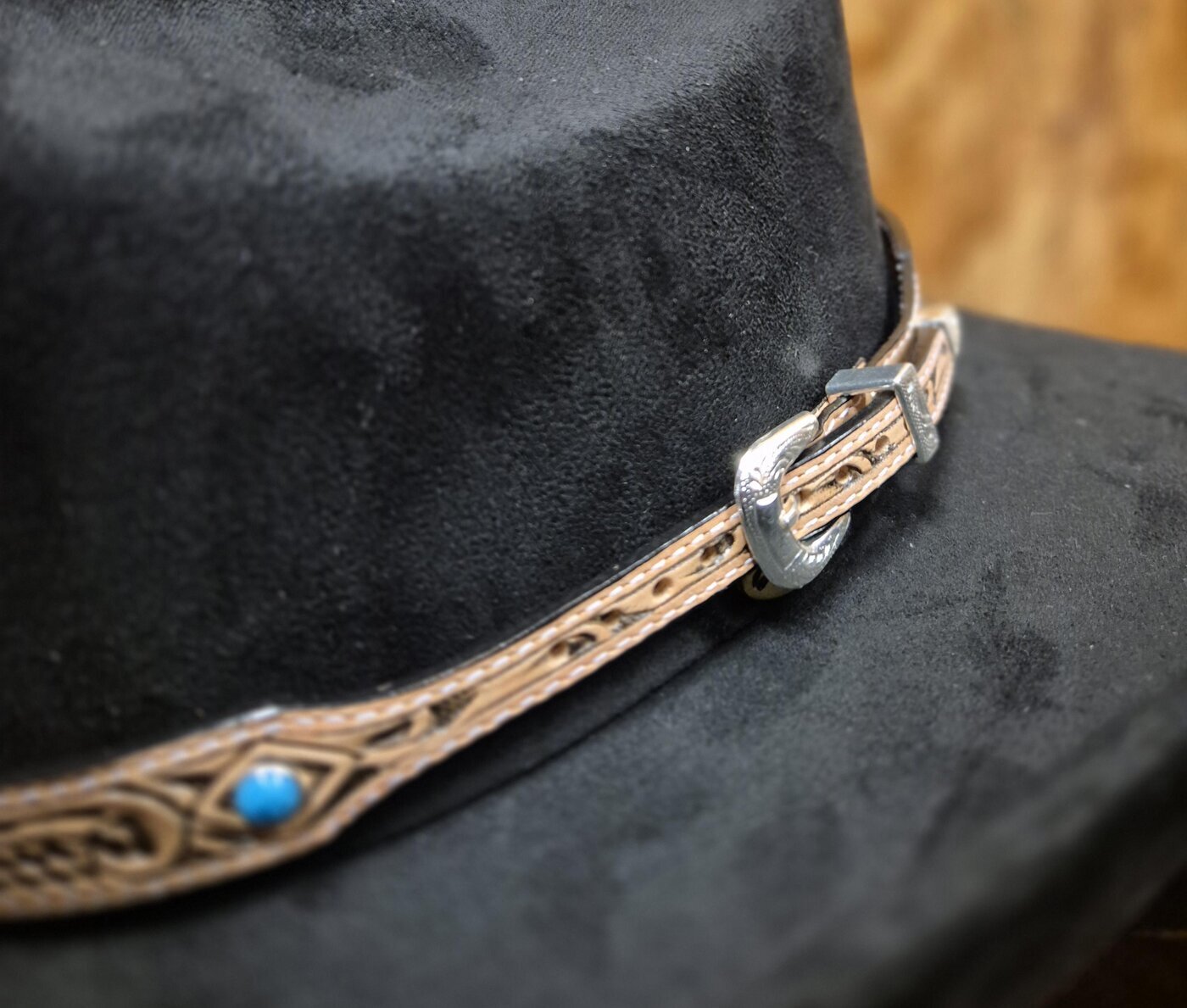 Vyön mallinen hattupanta vaaleaa, koristekuvioitua nahkaa, koristeena pyöreitä turkoosin värisiä kiviä.