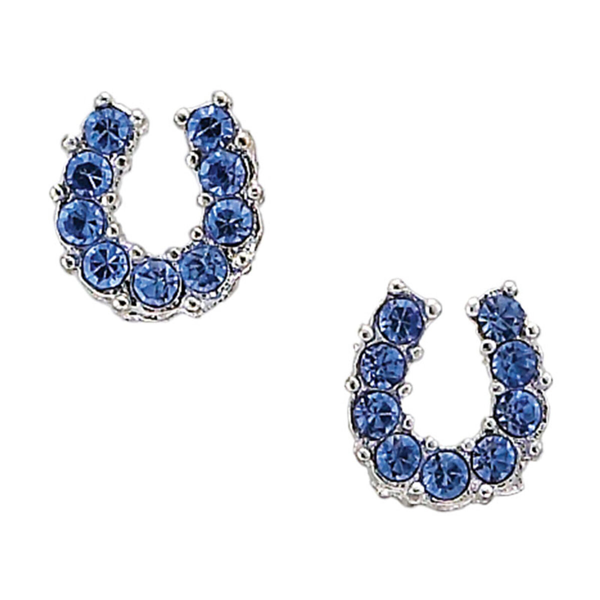 Vaalean sinisenväriset, nikkelivapaat hevosenkenkä-korvakorut sinisessä, hevosenpään-mallisessa korurasiassa.