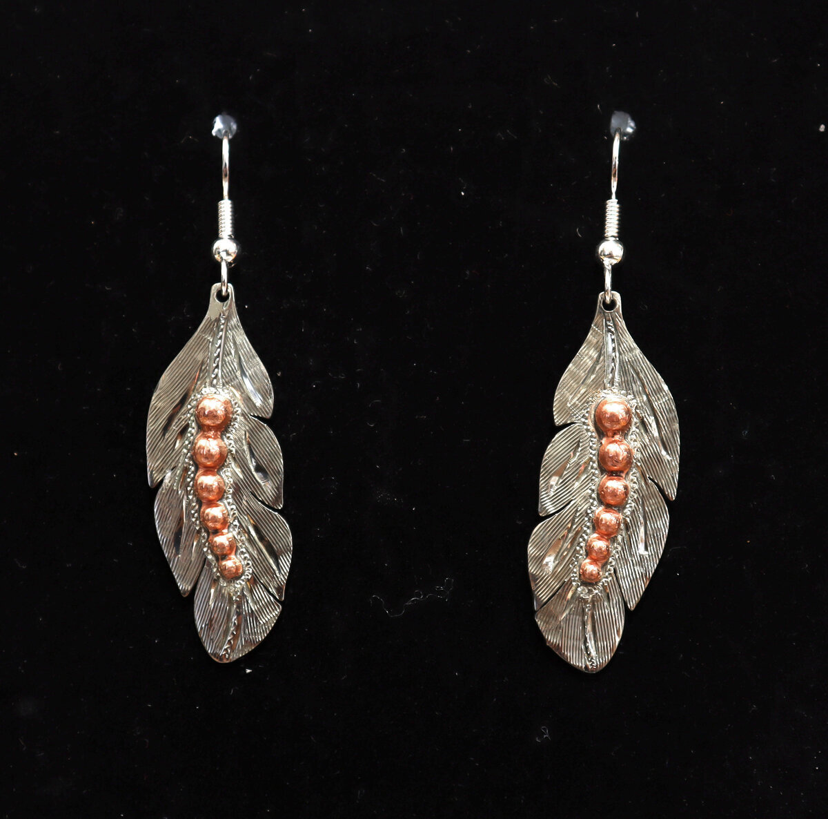 Koukkumalliset Sulkakorvakorut aidosta hopeasta ja yksityiskohdat kuparista.