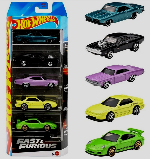 Viisi erilaista pikkuautoa samassa pakkauksessa.