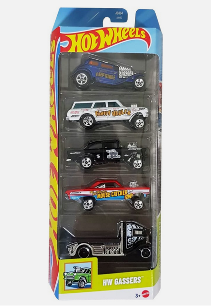 Viisi erilaista pikkuautoa samassa pakkauksessa.