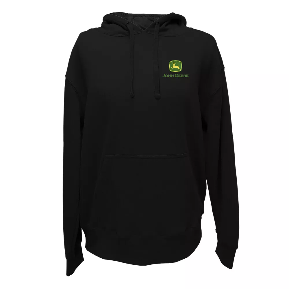 Musta perusmallinen umpinainen John Deere -huppari. Edessä kengurutasku ja rinnassa logo-painatus.