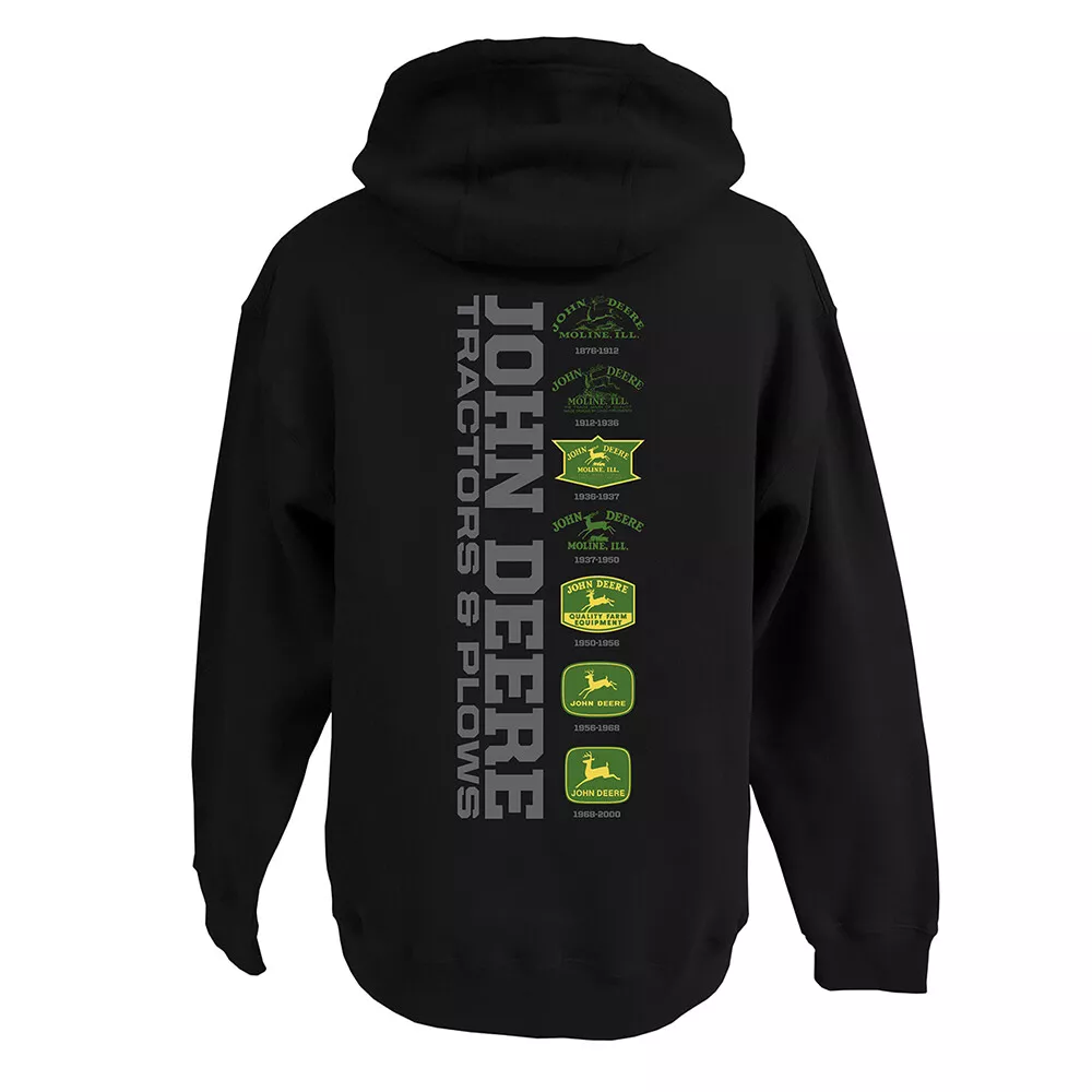Selässä iso painatus, jossa John Deere logoja vuosien varrelta.