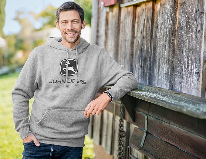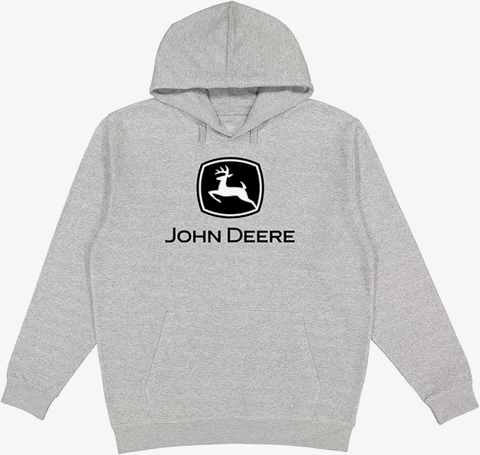 Harmaa perusmallinen umpinainen John Deere -huppari. Edessä kengurutasku ja logo.
