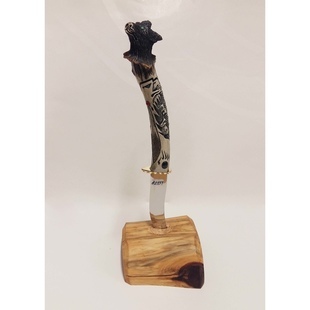 Navajo-intiaanien valmistama puukko ja jalusta. Varressa sudenpää.