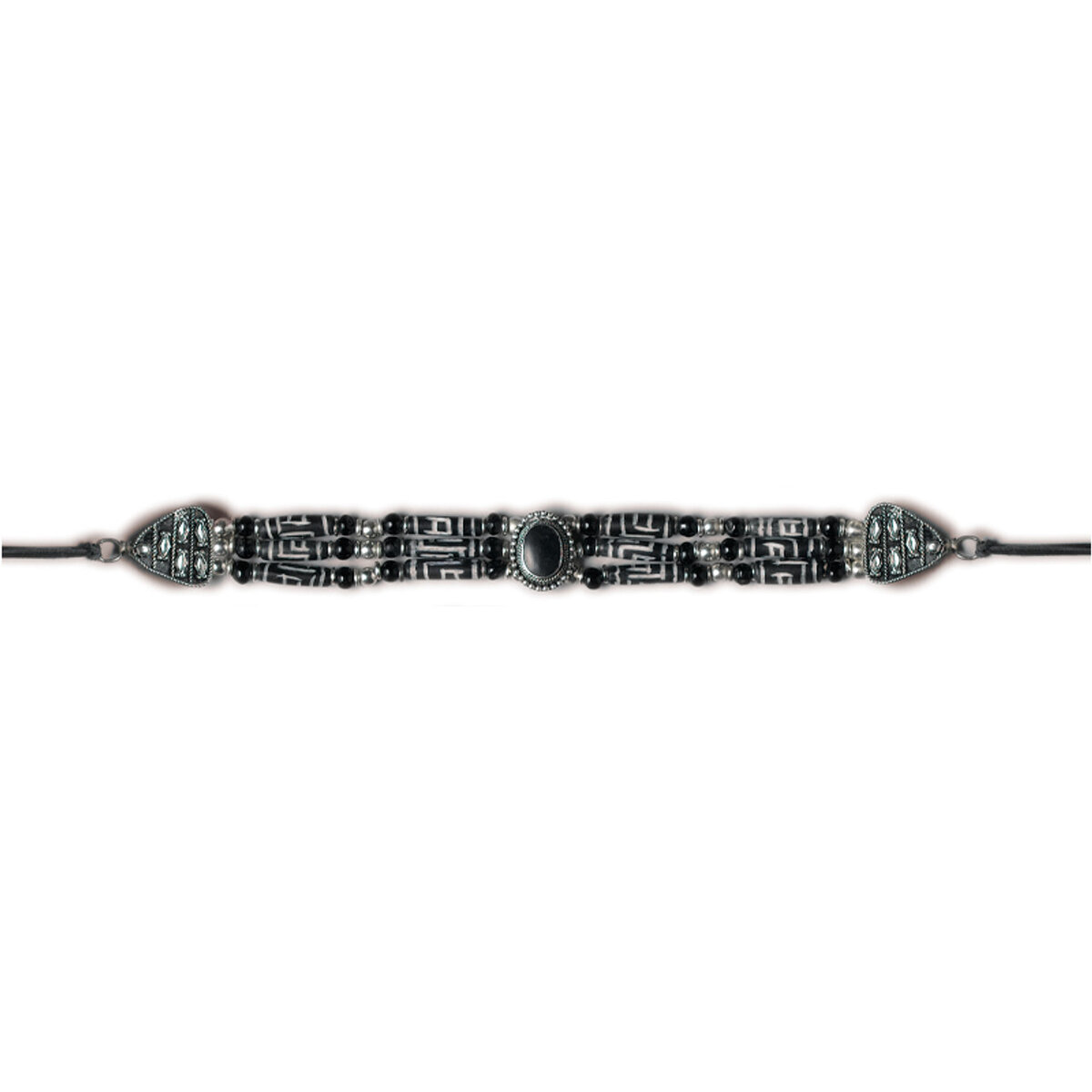 Valko-musta helmikaulakoru, joka solmitaan kaulaan.