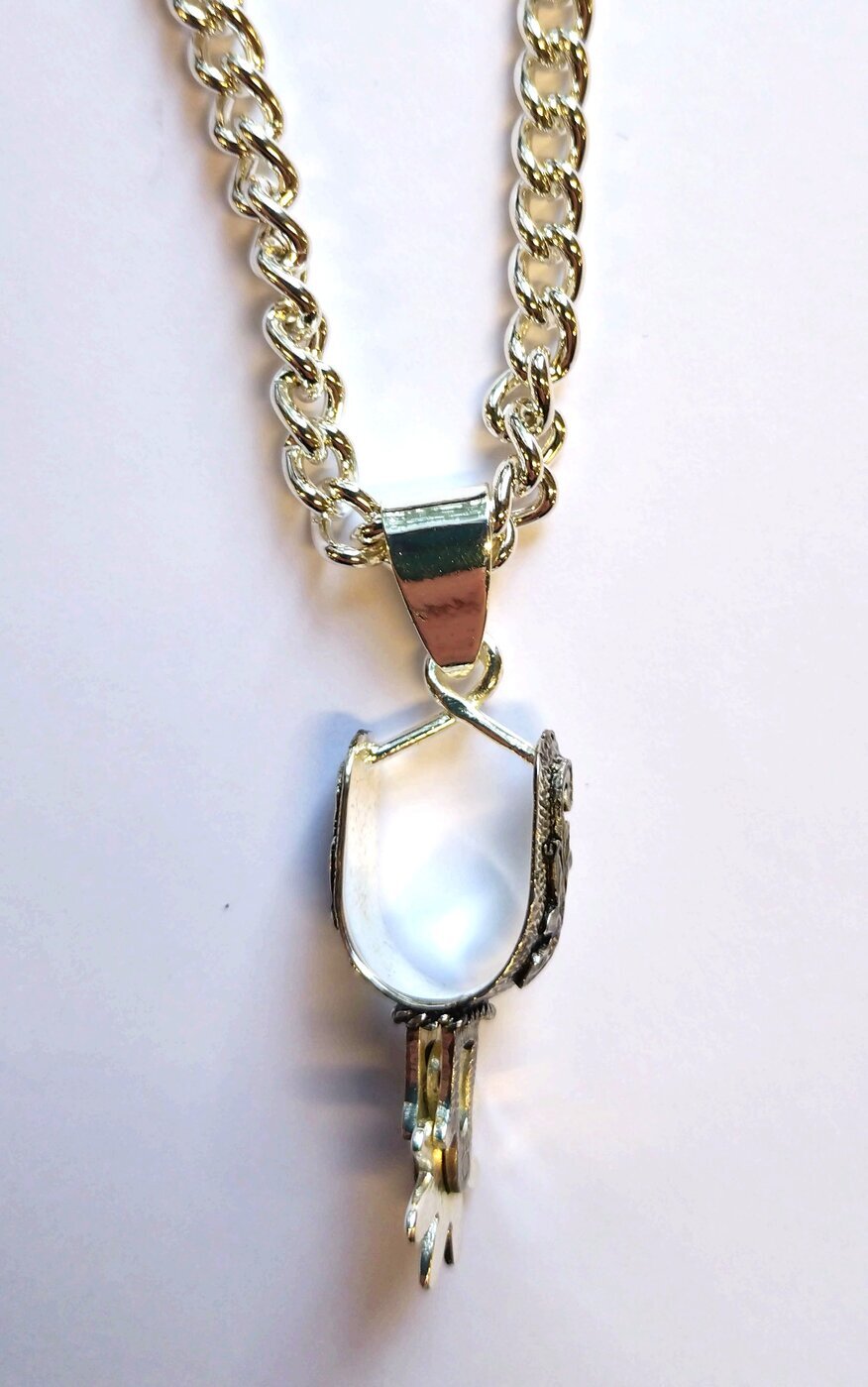 Hopean sävyisessä paksuhkossa ketjussa, koristekaiverrettu kannus riipus.