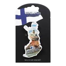 Polyresiinistä valmistettu Suomen kartan muotoinen jääkaappimagneetti, jossa katukuvaa Helsingistä ja teksti Finland sekä Suomen lipun kuva.