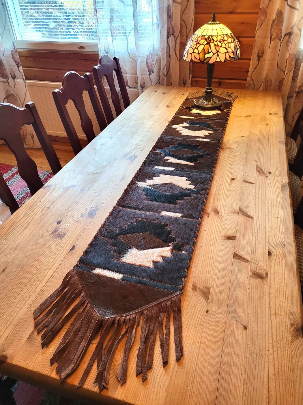 Materiaalina on brasilialainen lehmäntalja, josta on eri värisiä taljoja yhdistelemällä ommeltu kuviollinen, tyylikäs kokonaisuus.