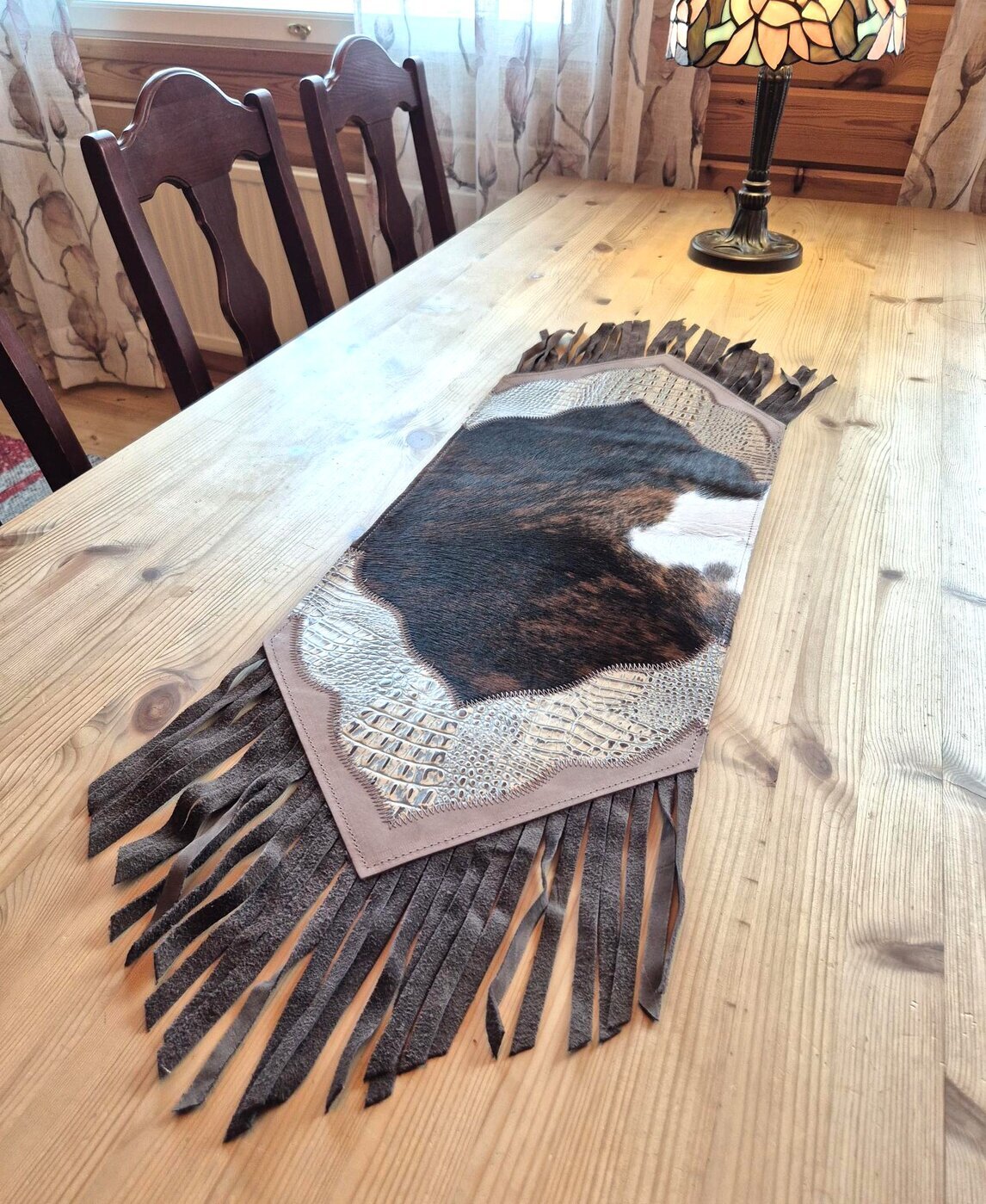 Materiaalina on brasilialainen lehmäntalja, josta on eri värisiä taljoja yhdistelemällä ommeltu kuviollinen, tyylikäs kokonaisuus. Vaaleanruskeat kohdat ovat karvatonta nahkaa, jossa tooled leather -kuviointi.