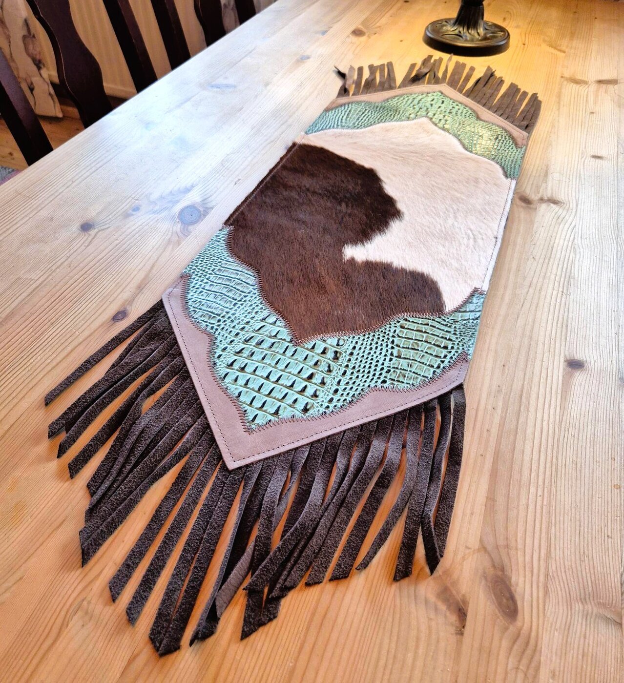 Materiaalina on brasilialainen lehmäntalja, josta on eri värisiä taljoja yhdistelemällä ommeltu kuviollinen, tyylikäs kokonaisuus. Turkoosit kohdat ovat karvatonta nahkaa, jossa tooled leather -kuviointi.