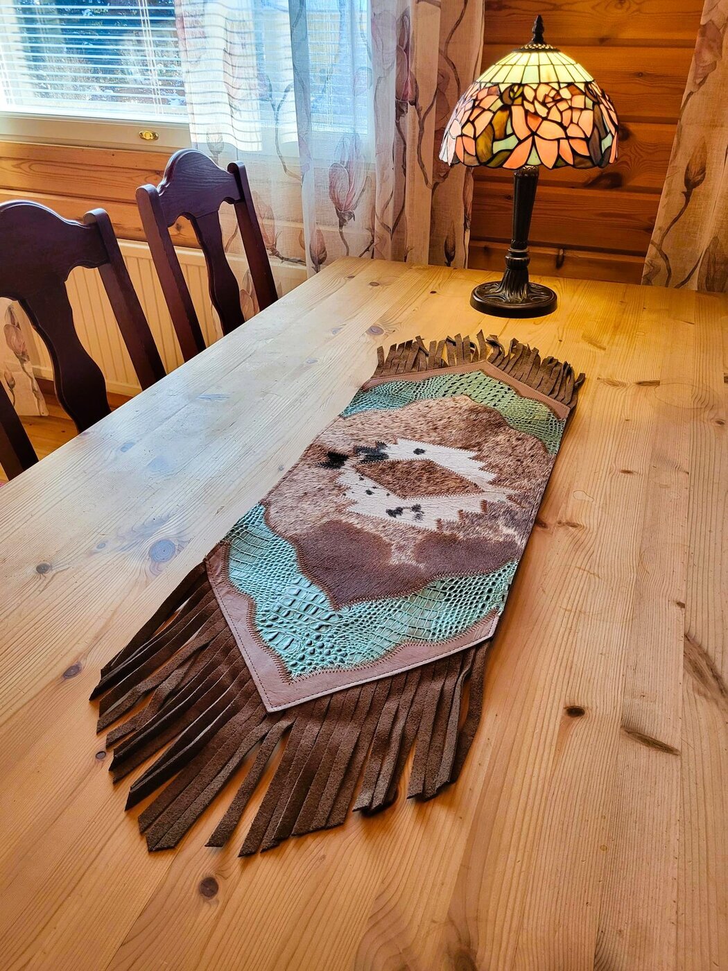 Materiaalina on brasilialainen lehmäntalja, josta on eri värisiä taljoja yhdistelemällä ommeltu kuviollinen, tyylikäs kokonaisuus. Turkoosit kohdat ovat karvatonta nahkaa, jossa tooled leather -kuviointi.