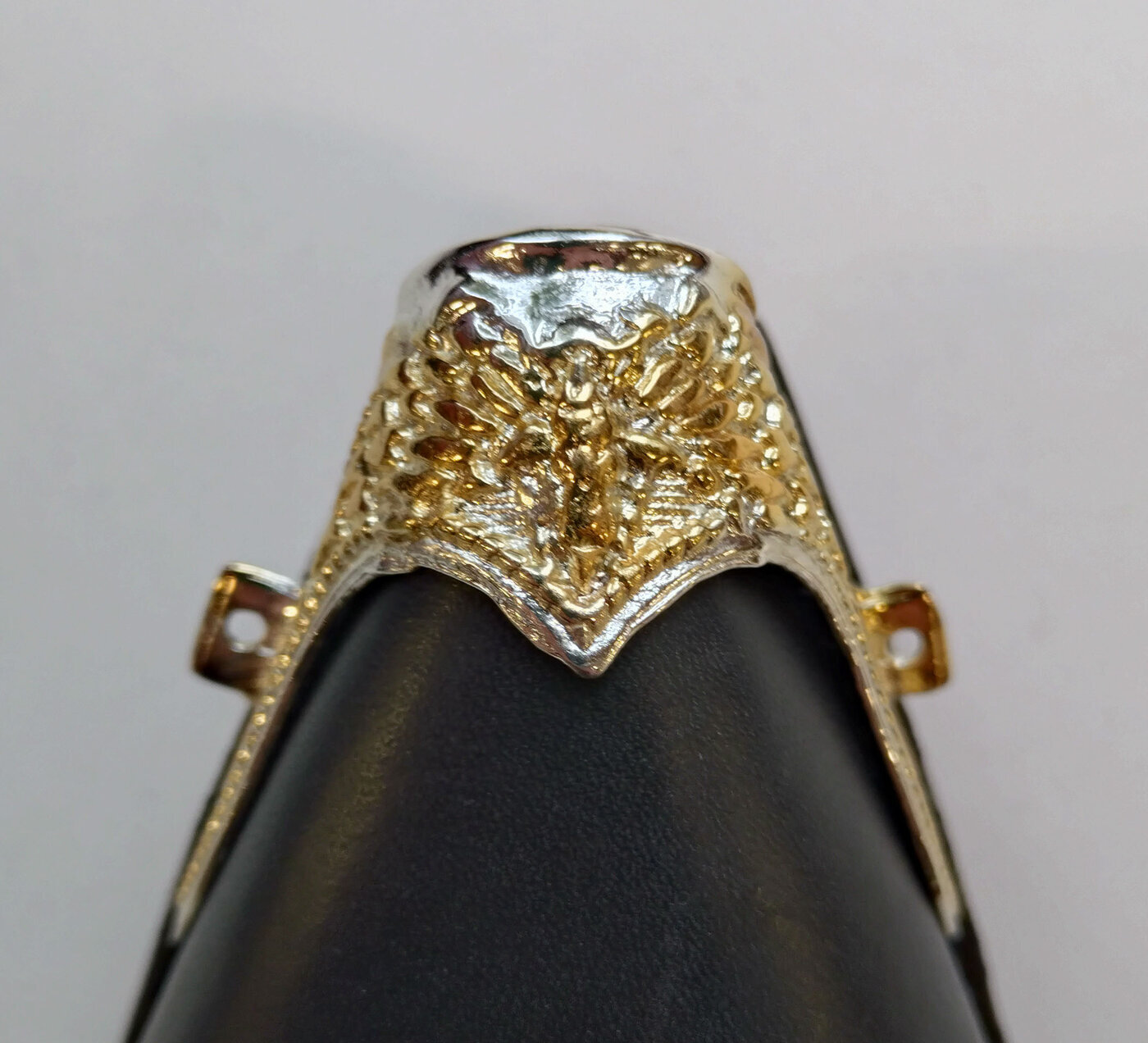 Hopean sävyiset kärkiraudat, kullan värisillä kohokoristeluilla. Teräväkärkisiin bootseihin.