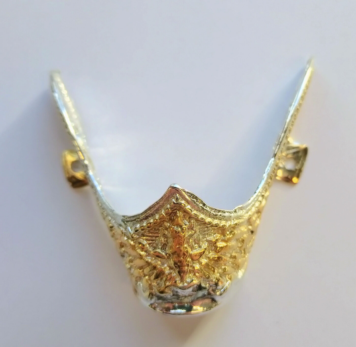 Kullan värinen kohokoristelu jonkinlainen lintu siivet levällään, (linnun vartalo keskellä, siivet leveävät sivuille).Mukana kiinnitystarvikkeet. Hinta / pari.