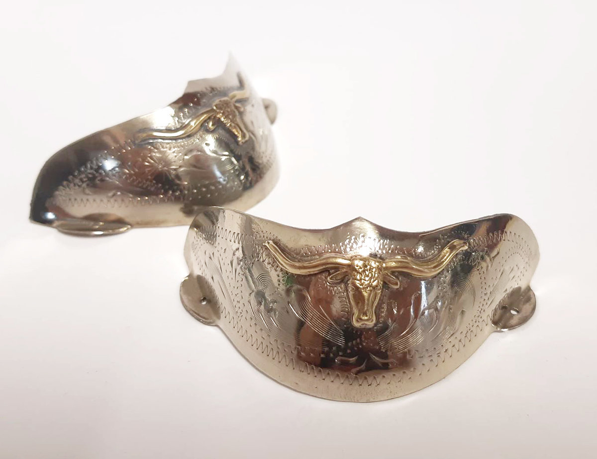 Leveä, pyöreän kärjen peittävä kärkirauta bootsiin. Rauta hopeanvärinen, härkäkuvio kullanvärinen.Mukana kiinnitystarvikkeet. Hinta / pari.