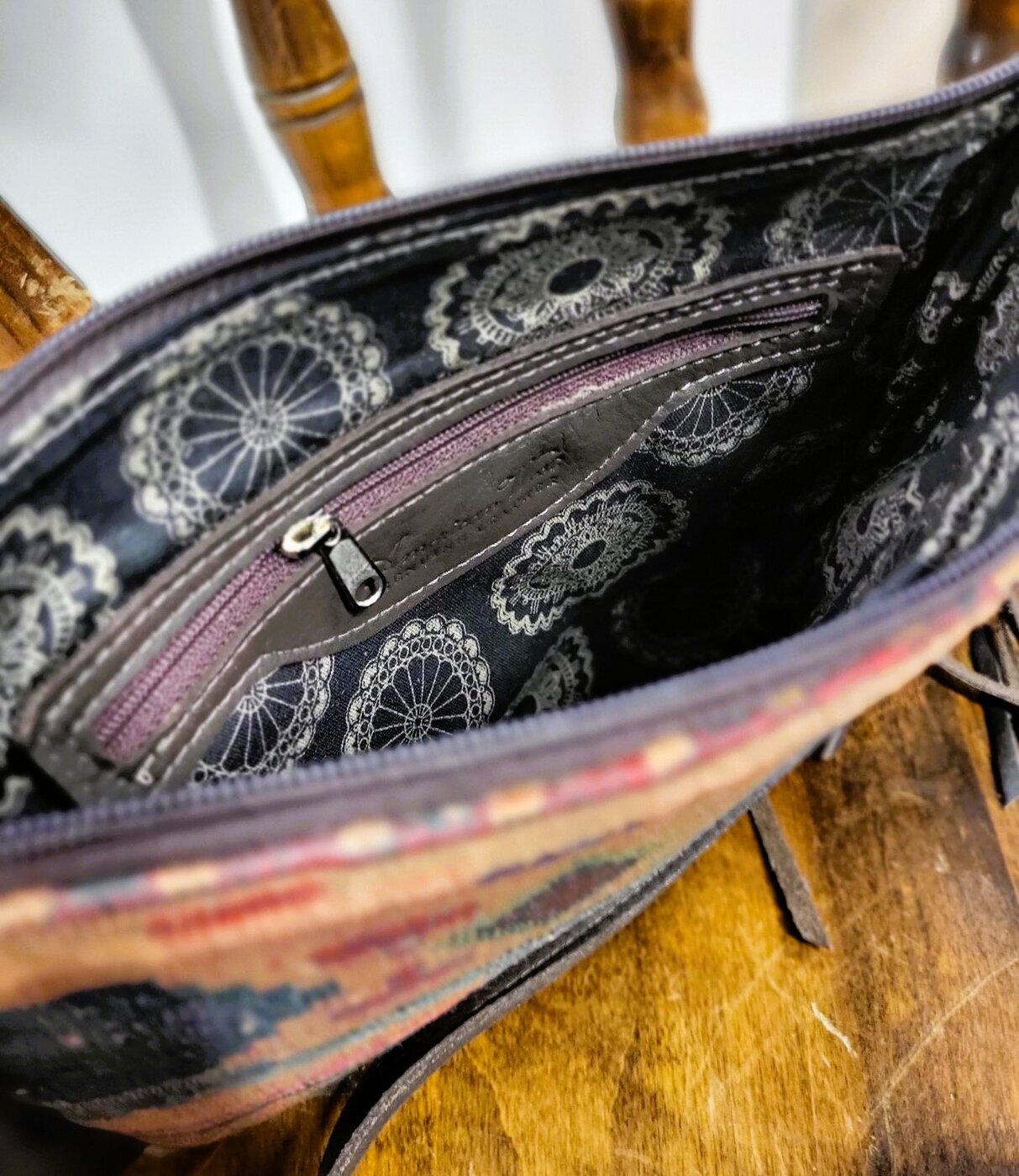 Laukun etupuoli southwestern pattern-kuvioitua kangasta, muuten laukku on nahkaa.
