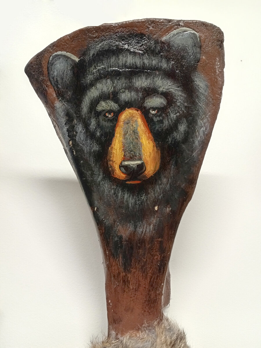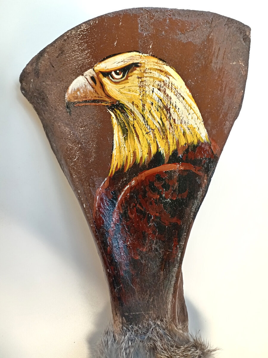 Materiaalit: varsi puuta, aito buffalon lonkkaluu, nahkaa, turkista, sulkia sekä muovihelmiä.