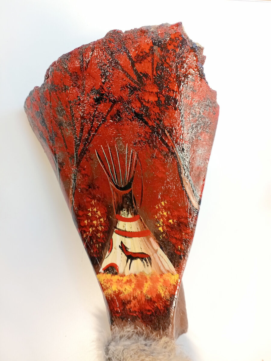 Navajo-intiaanien käsintekemä Medicine Stick / "lääkesauva" jossa kauniisti käsinmaalattu kojootin lonkkaluu.