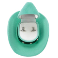 Hopeanvärinen, nikkelivapaa Bootsi-kaulakoru westernhatun mallisessa korurasiassa. Lahjarasioiden väri vaihtelee.