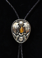 Hopeanvärisessä kaulusklipsissä musta taustakuviointi sekä tiger eye-kivet koristeena.