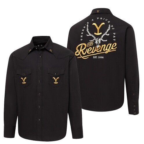 Musta kauluspaita, jossa Yellowstone-aiheiset brodeeraukset, edessä rinnassa sekä selässä.