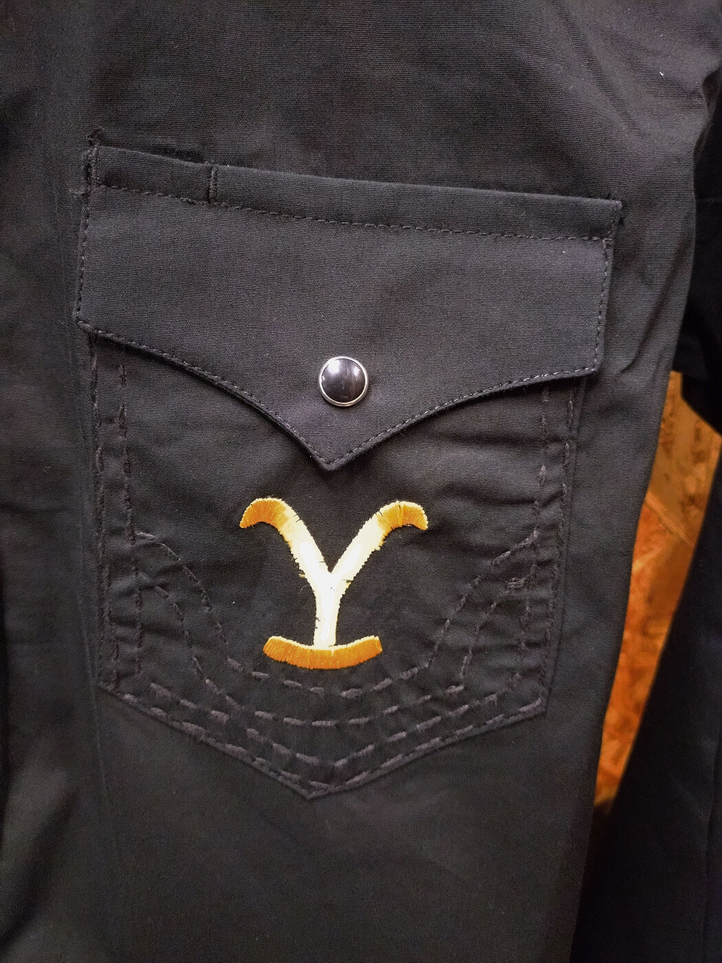 Musta westernpaita, jossa Yellowstone-aiheiset brodeeraukset, edessä kauluksien kulmissa, rinnassa sekä selässä.
