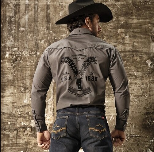 Tumman harmaa kauluspaita, jossa Yellowstone-aiheiset brodeeraukset ja painatukset selässä ja edessä kauluksien kulmissa Y-logot.