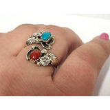 Kauniisti sormen ympärille kietoutuva sterling hopeaa oleva sormus, jossa Kingman -turkoosi sekä punainen koralli.