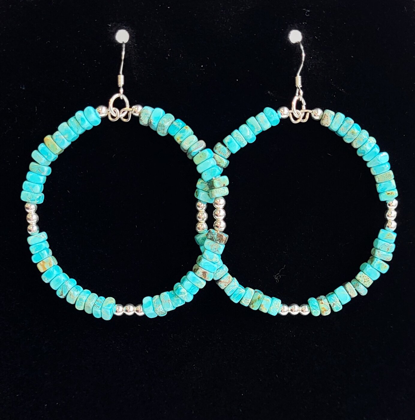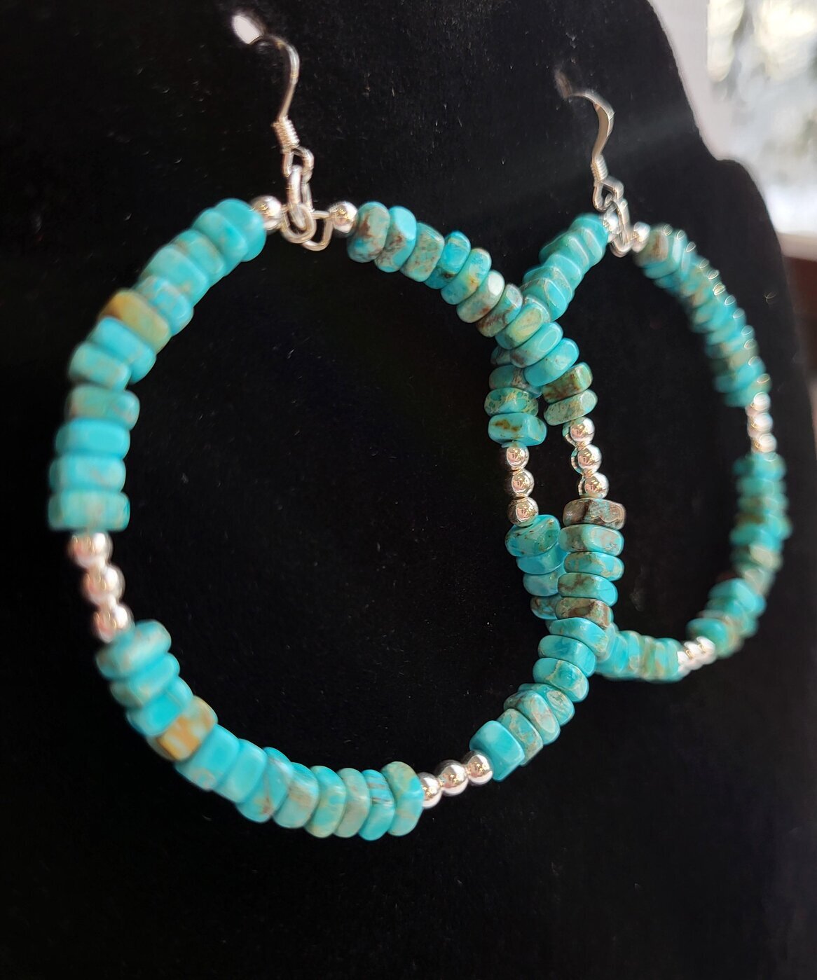 Näyttävät rengaskorvikset, joissa Kingman Turquoise -kiveä. Metalliosat stearling hopeaa.