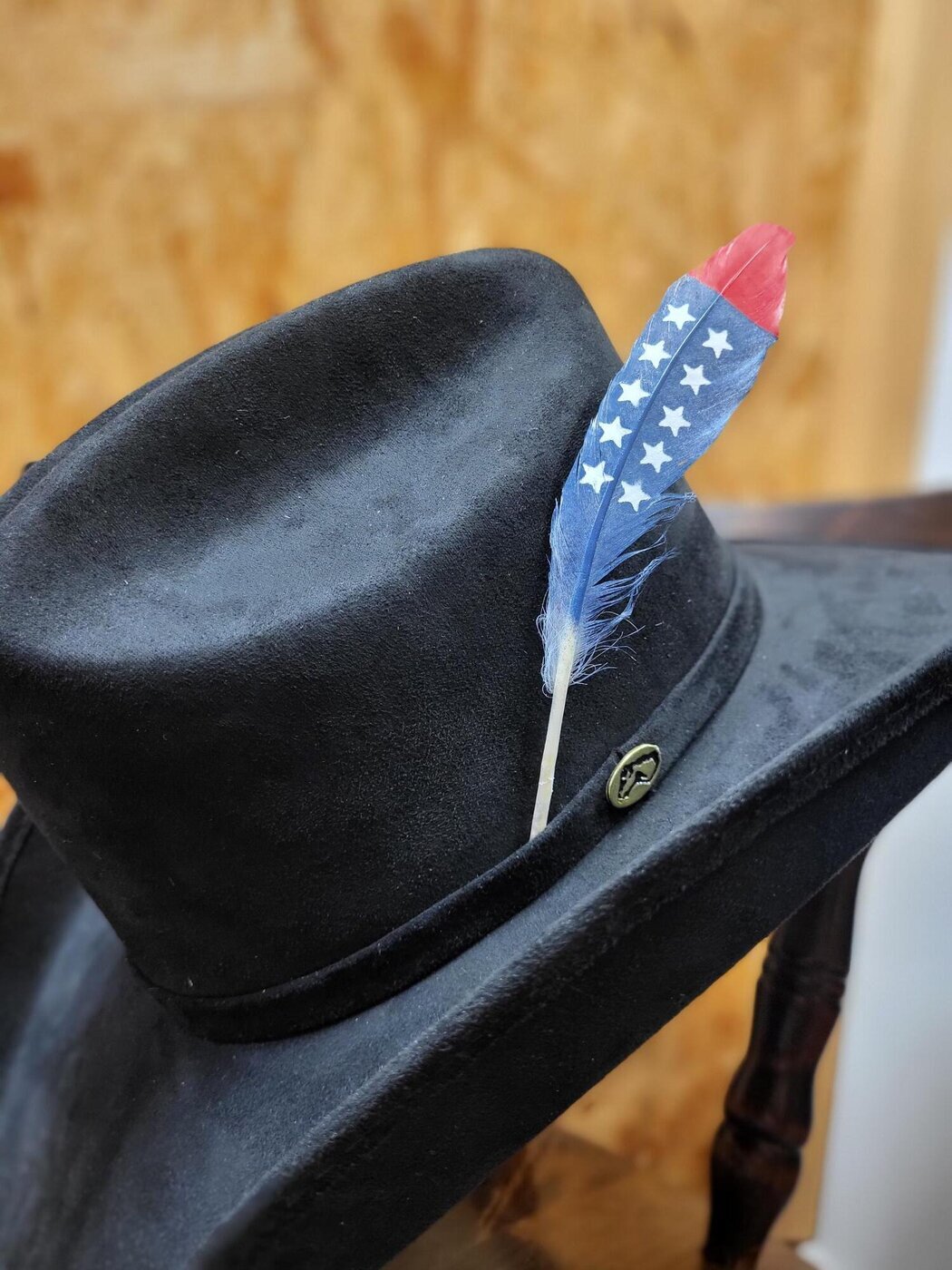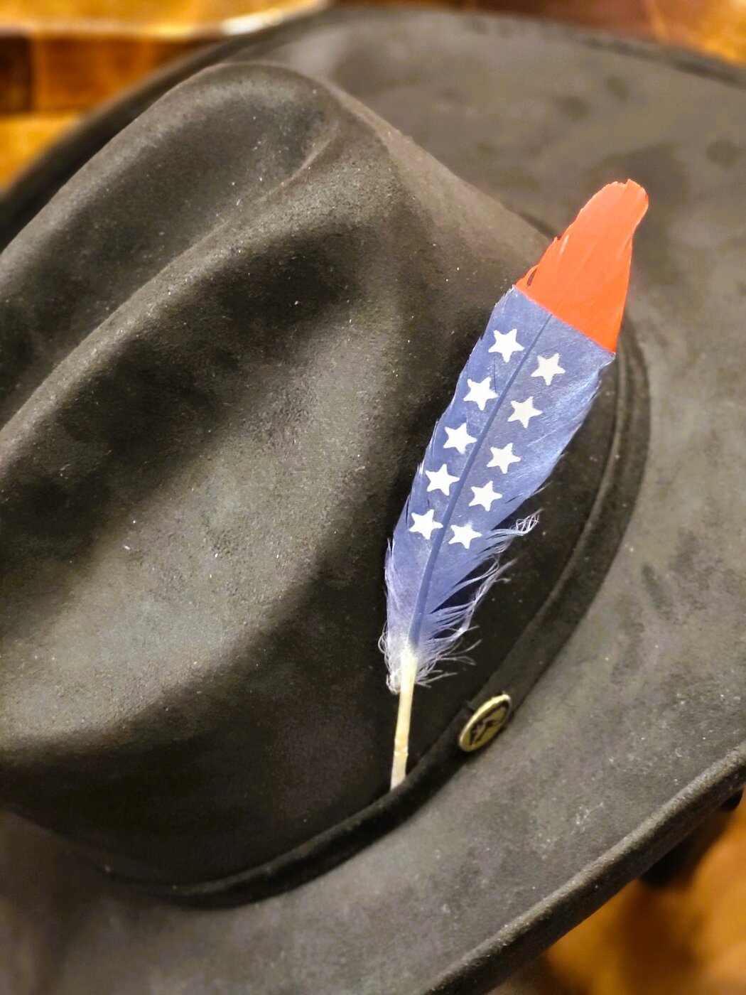 Yksittäinen, USA-lipun väreillä värjätty, aito luonnon sulka koristeeksi esim. hattuun.