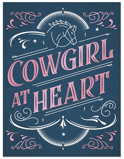 Taitettu Cowgirl at Heart syntymäpäiväkortti, jossa sisällä teksti "...boots, class and a touch of sass! Happy Birthday "