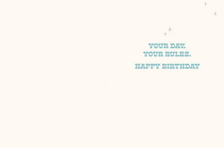 Taitettu I'm doing this new thing called whatever I want! kortin sisällä teksti "YOUR DAY. YOUR RULES. HAPPY BIRTHDAY"